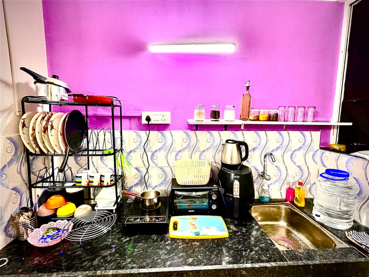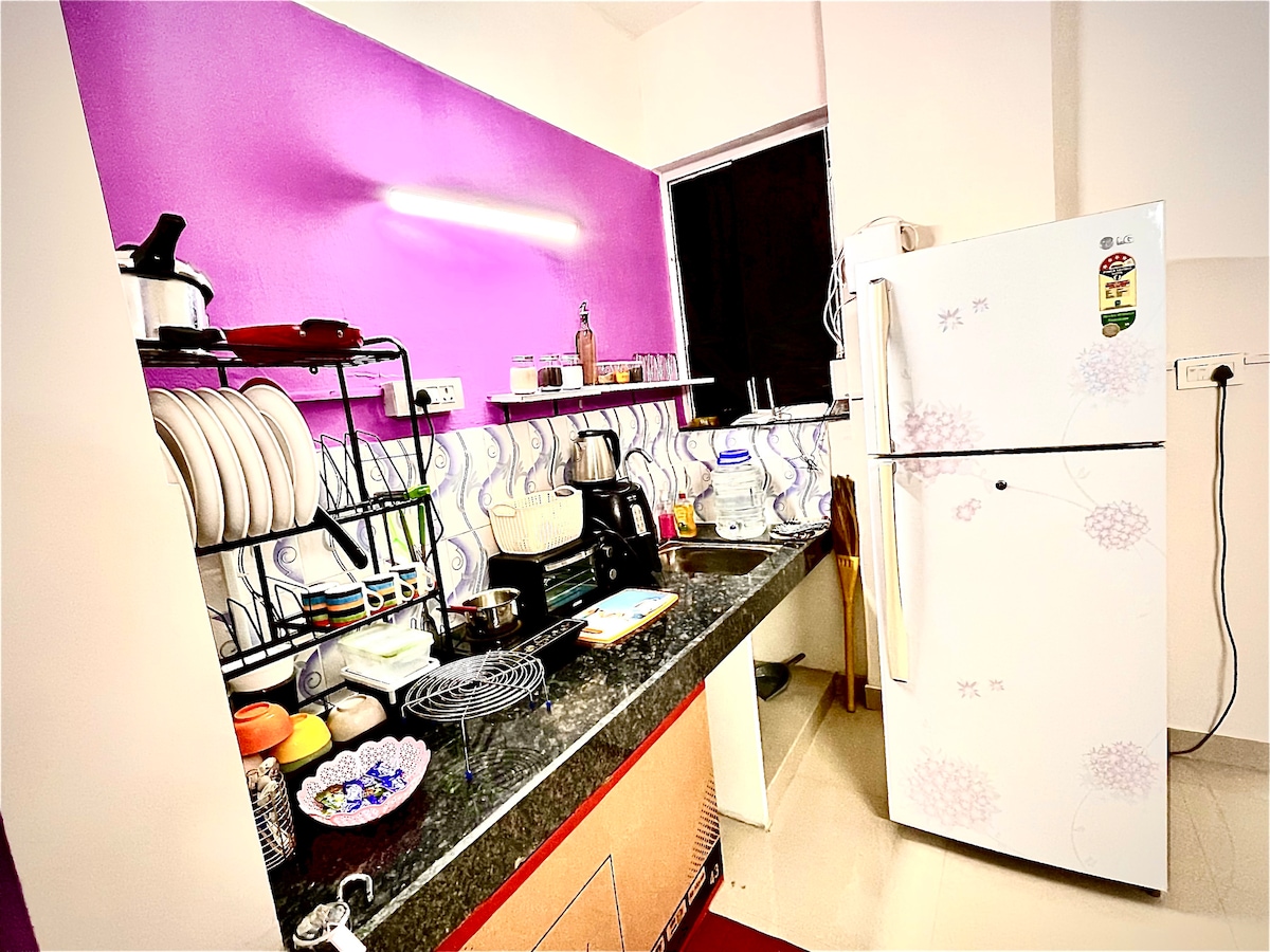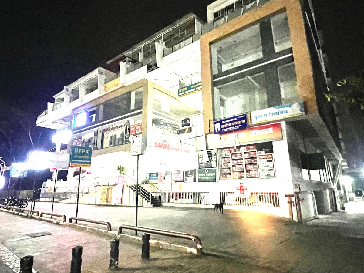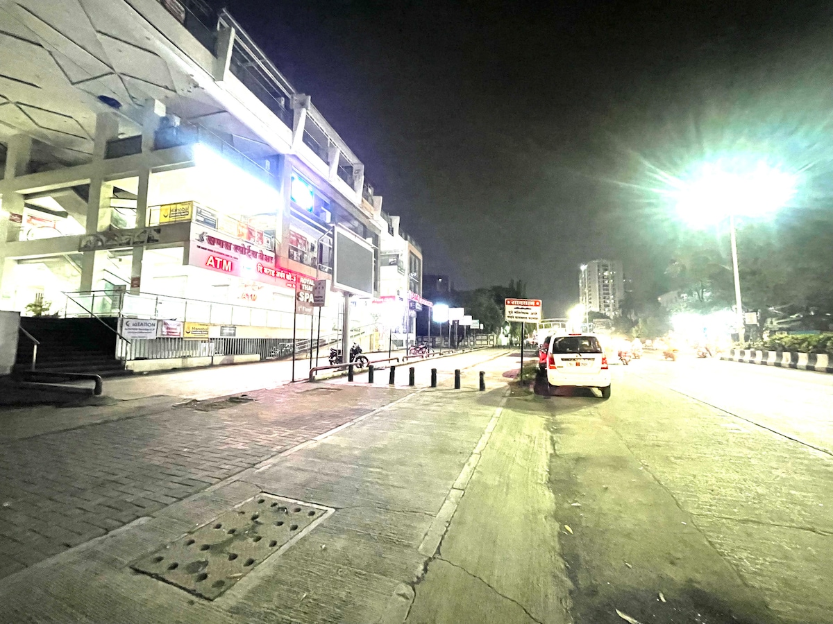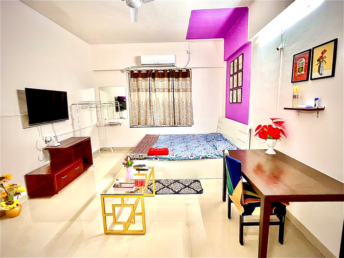 Charming studio apartment on Sinhgad Road, Pune, perfect for solo travelers or couples. Cozy, open-plan layout with a queen-sized bed, comfortable living area, and modern kitchenette (microwave, air fryer, mini-fridge). Includes free Wi-Fi, AC, 44" 4K smart TV (Netflix, Prime), and inverter backup. Conveniently located near Kothrud, Karve Nagar, and Swargate. Public transport and private transport options (Auto, Ola, Uber) are available. No smoking allowed. Features covered parking, self-check-in, cleaning staff, and complimentary groceries. Ideal urban retreat close to attractions and dining.