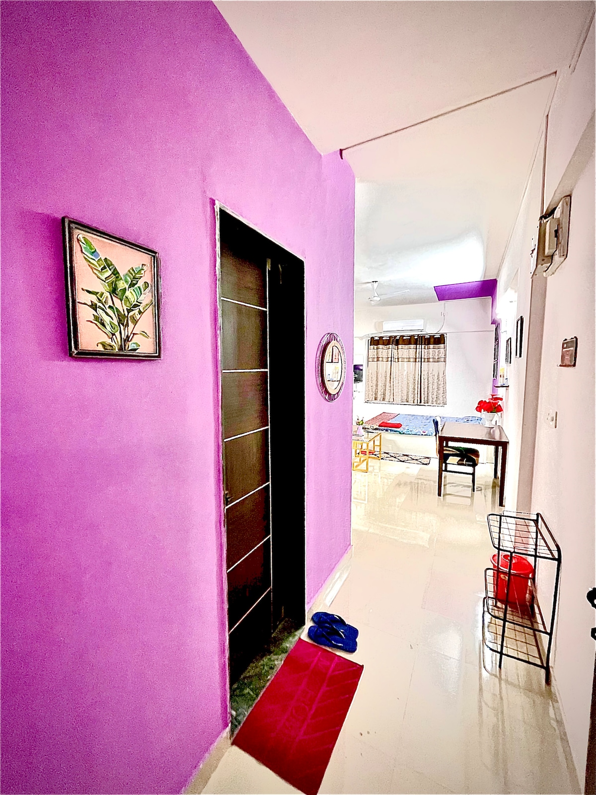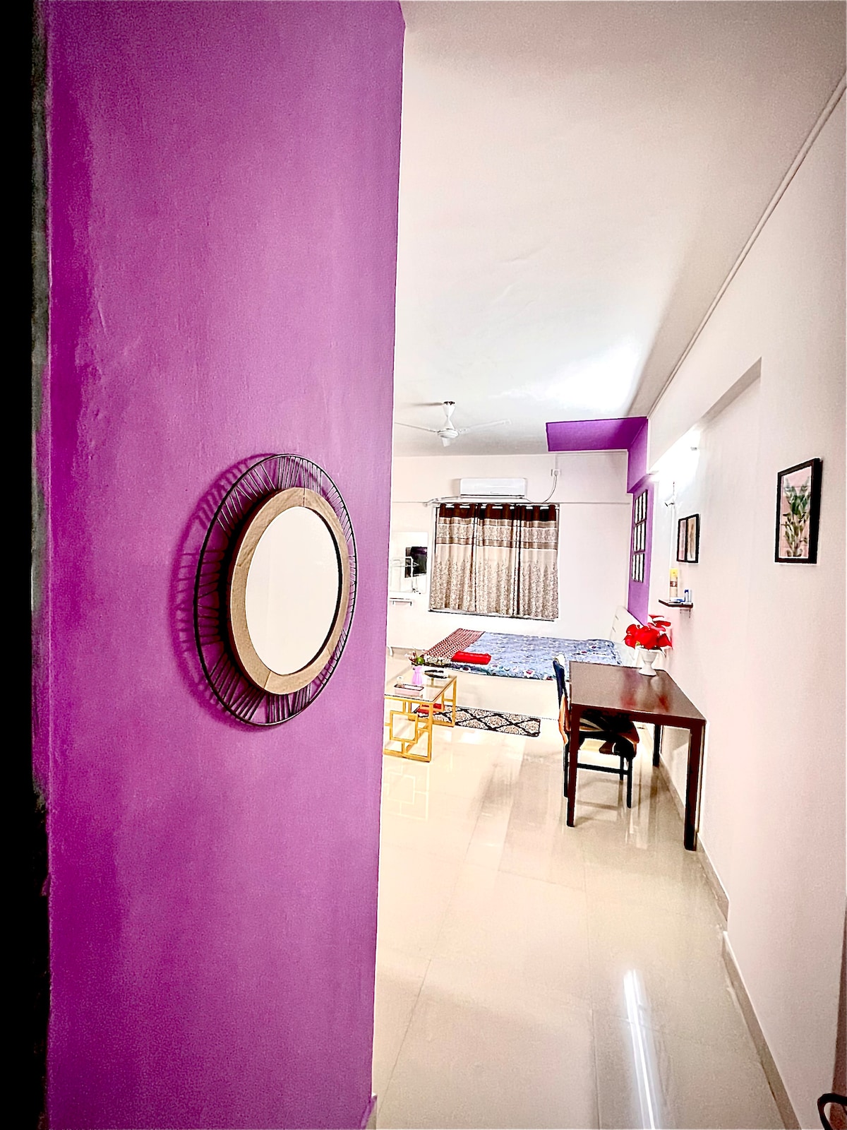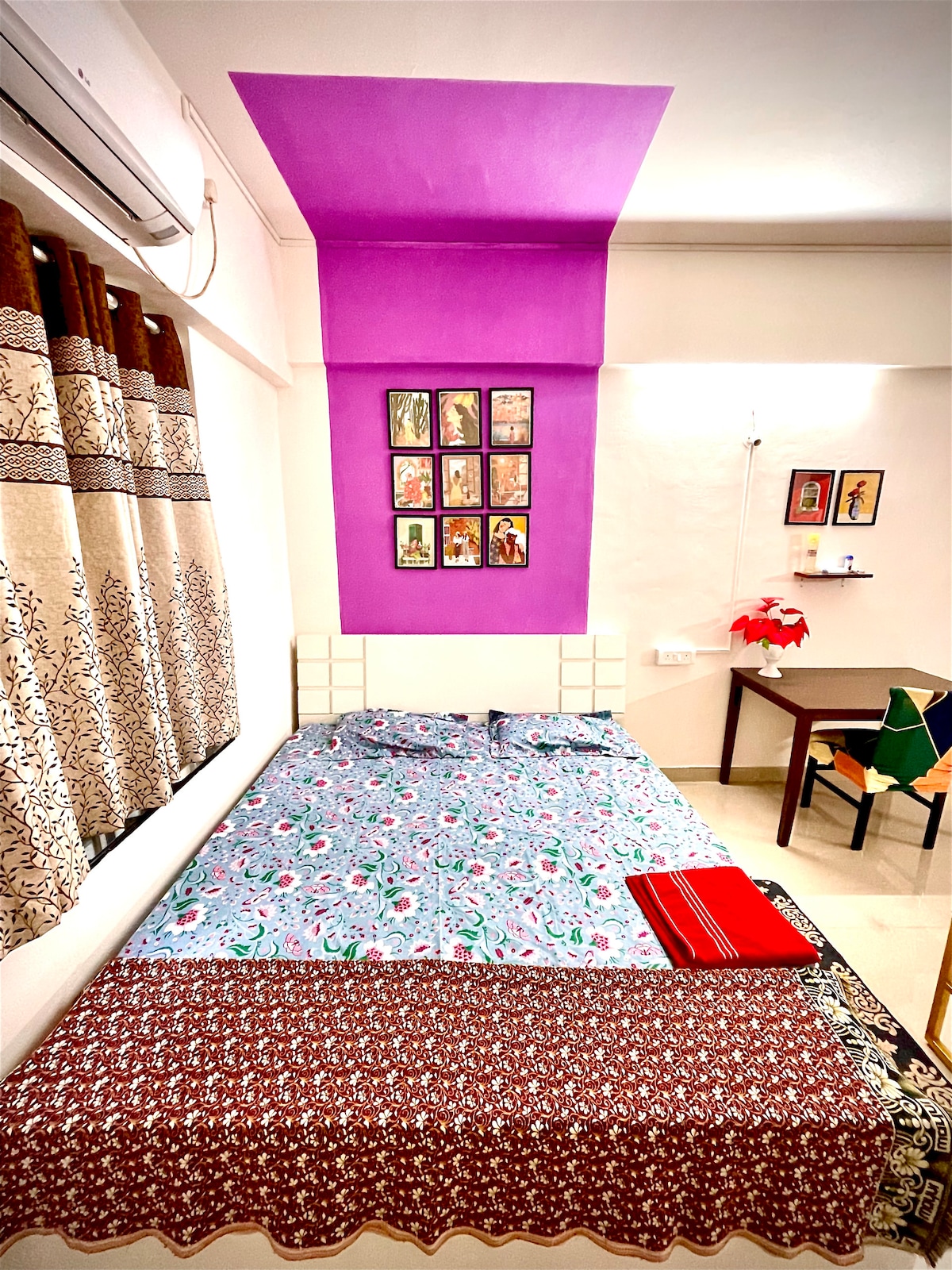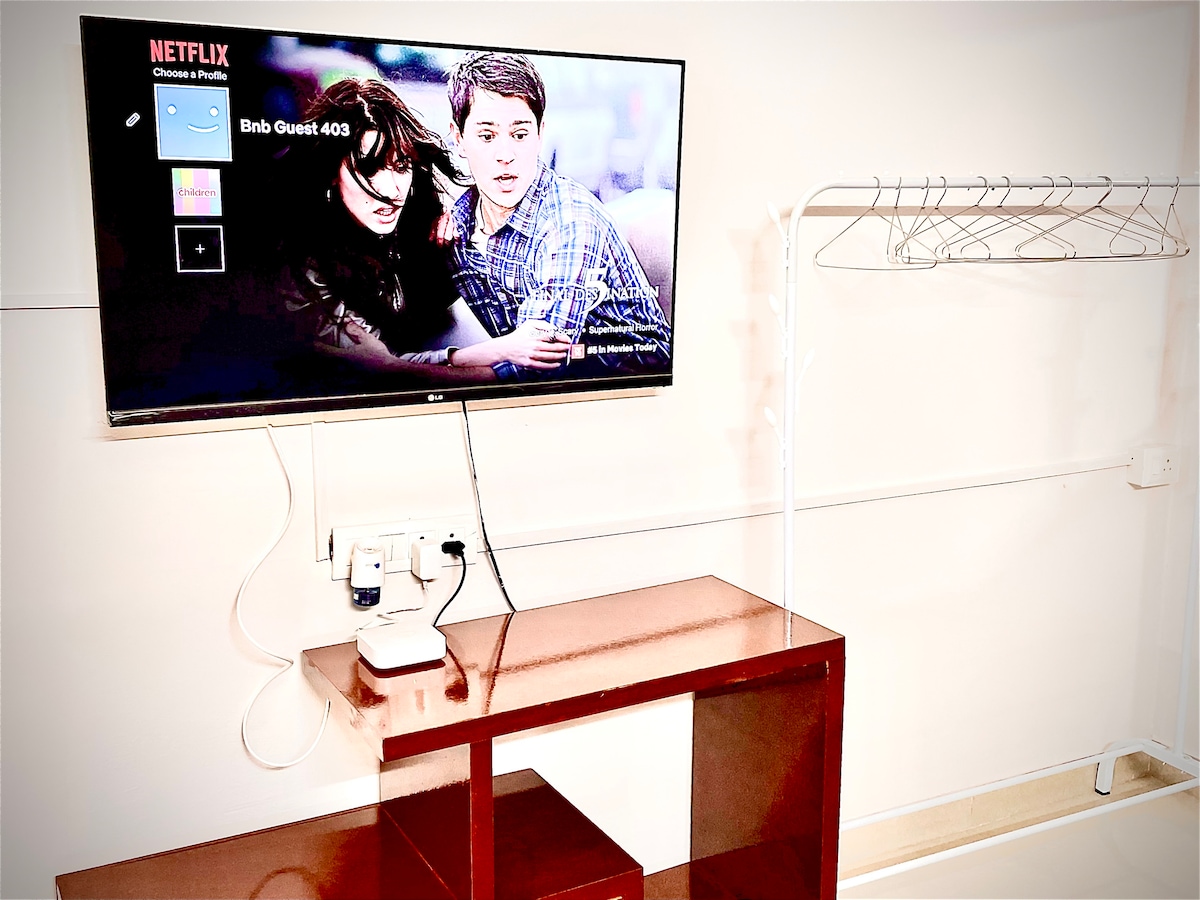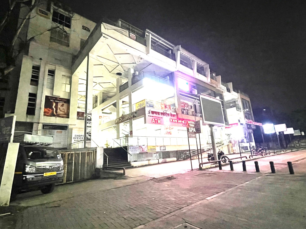 Charming studio apartment on Sinhgad Road, Pune, perfect for solo travelers or couples. Cozy, open-plan layout with a queen-sized bed, comfortable living area, and modern kitchenette (microwave, air fryer, mini-fridge). Includes free Wi-Fi, AC, 44" 4K smart TV (Netflix, Prime), and inverter backup. Conveniently located near Kothrud, Karve Nagar, and Swargate. Public transport and private transport options (Auto, Ola, Uber) are available. No smoking allowed. Features covered parking, self-check-in, cleaning staff, and complimentary groceries. Ideal urban retreat close to attractions and dining.